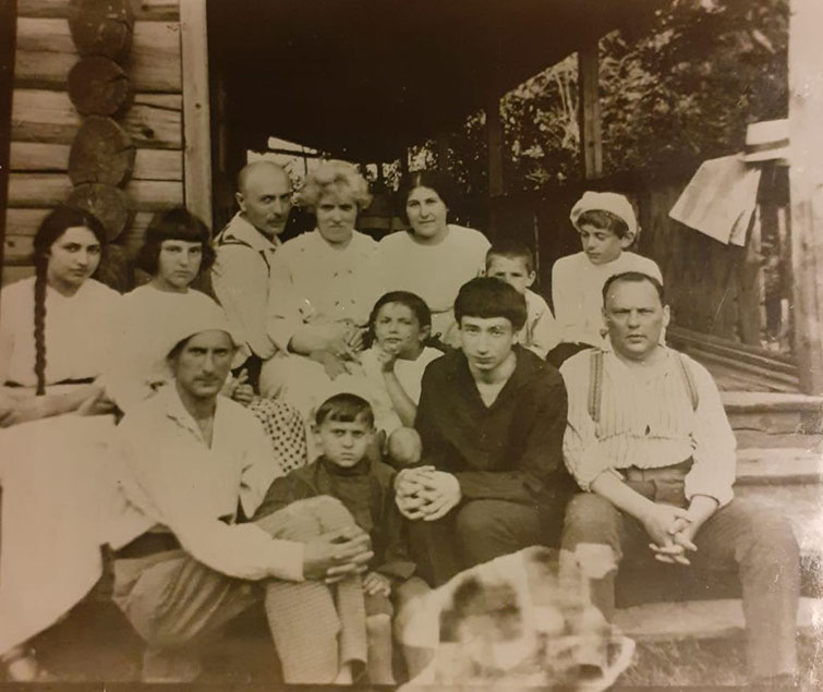Во второй части этих очерков - «Ищите и обрящете...» я упомянул книгу Анны Масс «Писательские дачи», в которой писательница, в частности, рассказывала о визите своего отца Владимира Масса к родственникам Либаковым в Витебск. Во время этого визита была сделана фотография, которая как бы связывает вместе представителей трёх ветвей генеалогического древа - Массов, Либаковых и Шнеерсонов. Эта, уже ставшая исторической, фотография хранилась длительное время у Анны Масс, а после её смерти копию этого фото прислала Нине Поповой Мария Янтовская, близкая родственница Анны. На фотографии, снятой летом 1914 года на крыльце дома в деревне под Витебском, предположительно, Доброполье, можно увидеть, в частности, и Гришу Шнеерсона: он во втором ряду - первый справа, в белой панамке.