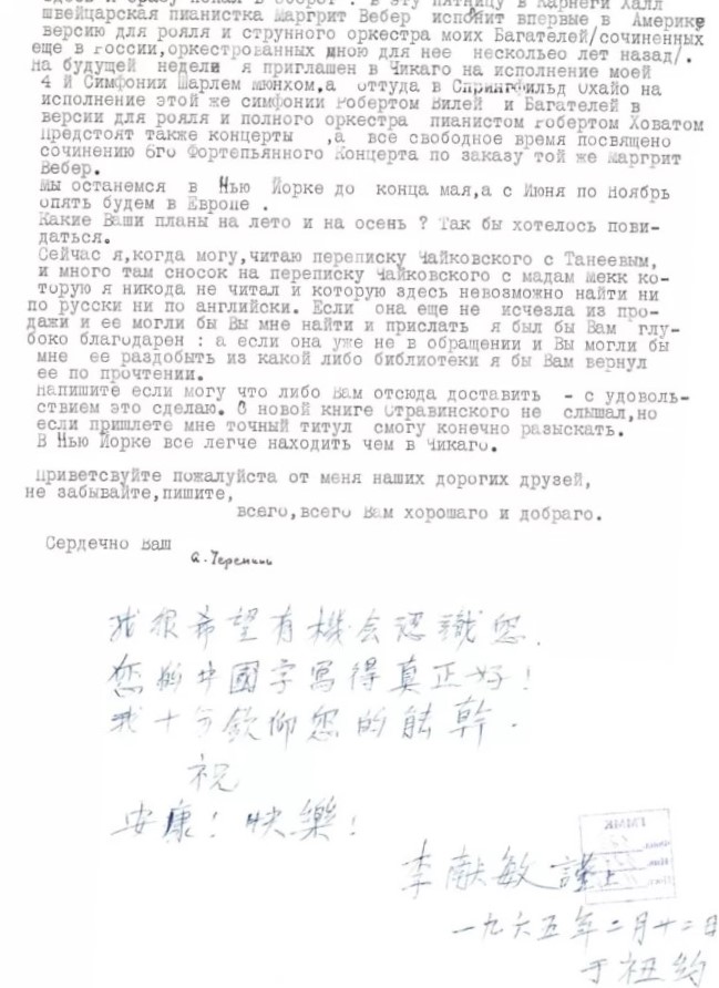 Фрагмент письма А.Н.Черепнина к Г.М.Шнеерсону с припиской