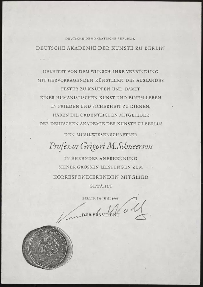 Диплом чл.-корр. Академии искусств ГДР, Берлин, июнь 1968 г.