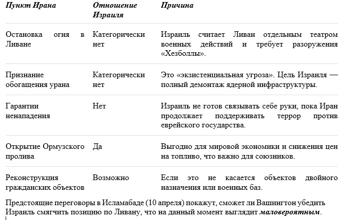 Пункт 4 (Снятие санкций): Израиль будет выступать против, но если это станет ценой за полный демонтаж ядерной программы (чего в плане Ирана нет), то теоретически это предмет для торга.