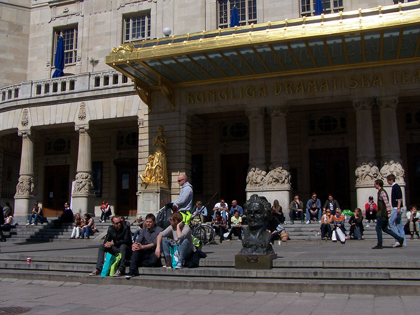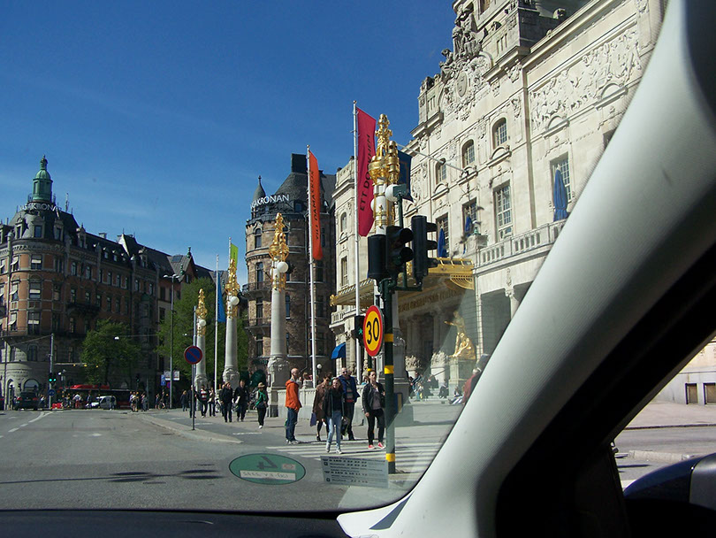 Когда мы приехали в Стокгольм в первый раз, а это было в 2009 году, нам пришлось добираться до порта, проехав прямо через центр города. С одной стороны это было очень интересно. Город восхитил своей красотой и великолепием. Мощные монументальные, напоминающие о былом имперском величии дворцы, здания с заметным влиянием итальянской архитектурной школы, сверкающее золотом здание государственного драматического театра, - всё это соседствовало с ультрасовременными билдингами промышленных и торговых компаний, сверкающих роскошью витринами огромных универмагов, бутиков, бесчисленными ресторанами и кафе. Широкие набережные многочисленных бухт и заливов, панорамы, иногда напоминающие Санкт-Петербург, тенистые парки, скверы бульвары. Правда, всей этой красотой удавалось любоваться только Валентине. На мою же долю выпало потеть, разбираясь в сложной и не всегда чёткой, иногда полностью стёртой дорожной разметке, лавировать в плотном потоке автомобилей, велосипедов и пешеходов, вовремя замечать выделенные полосы для автобусов, дорожные знаки, светофоры, и всё это постоянно сверяясь с подсказками навигатора. Короче говоря, из красот города мне удавалось видеть лишь малую толику. В последующие годы всё это, правда, удалось восполнить за счёт пешеходных прогулок и автобусной экскурсии, о которой рассказ ещё впереди.