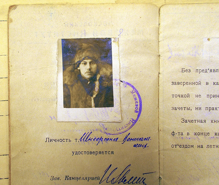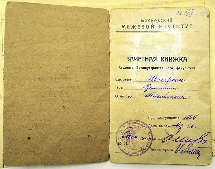 Рассказ о детях Менделя и Рахили Шнеерсонов начну с их младшего сына, Вениамина. Он родился в 1908 году в Витебске, куда его родители возвратились из ссылки в Восточную Сибирь. После окончания школы в 1925 году, в семнадцатилетнем возрасте, Вениамин поступил на землеустроительный факультет Московского межевого института, который окончил в 1929 году. Позже, уже в 1930 году, это учебное заведение было преобразовано в Московский институт землеустройства. В Центральном историческом архиве Москвы (ЦИАМ), в разделе «Документы студентов Межевого института», была обнаружена зачётная книжка Вениамина с его фотографией, на которой он снят в каком-то тулупе и даже в шапке. Видимо, не до «дресс-кода» на фото для документов было в те «суровые» годы.